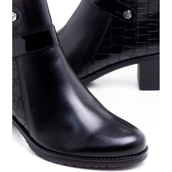 * Botí per a dona fabricat amb pell de gran qualitat amb composició de pell llisa i a la part del darrera amb textura de cocodril.