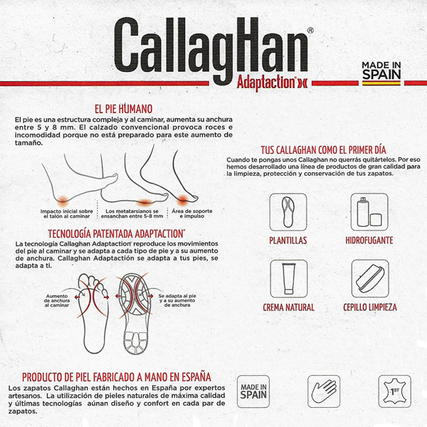 * Callaghan proporciona una tecnologia ADAPTATION, on el peu al caminar aumenta la seva amplada entre 5 i 8 mm, això fa que s'adapta a aquest canvi de mida i converteixi el caminar en un plaer.