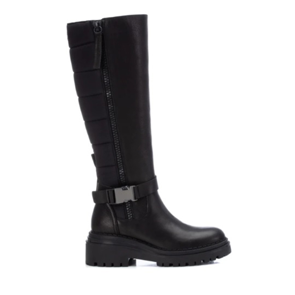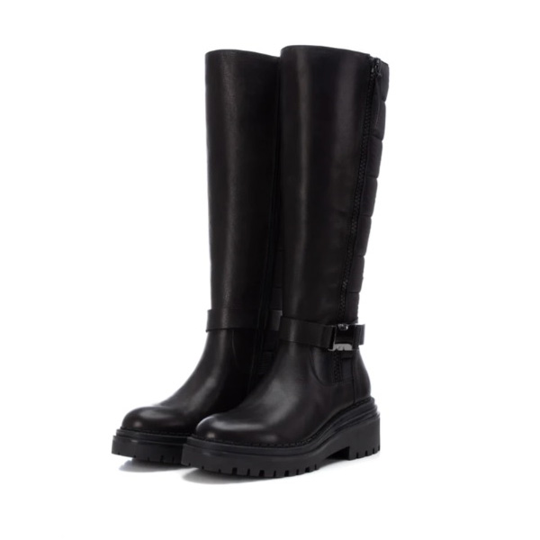 * Bota de dona, fabricada amb pell i combinada amb nylon encoixinat.