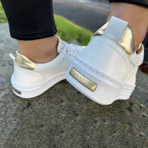 * Detall daurat a la part del taló i xapa daurada també amb el logo de la marca CARMELA.
