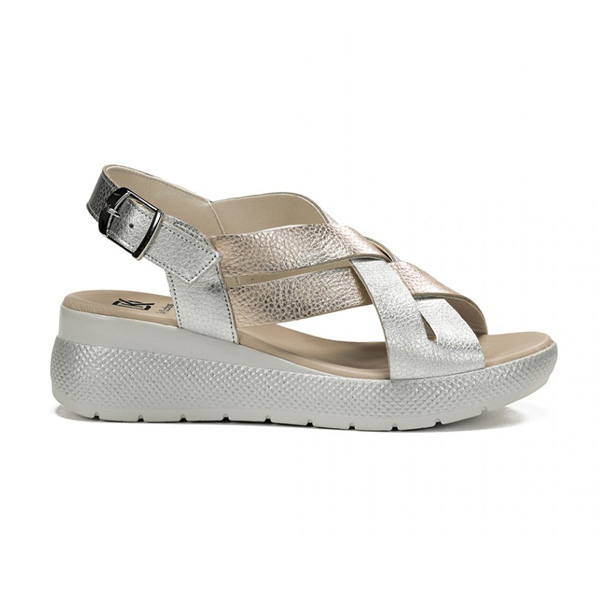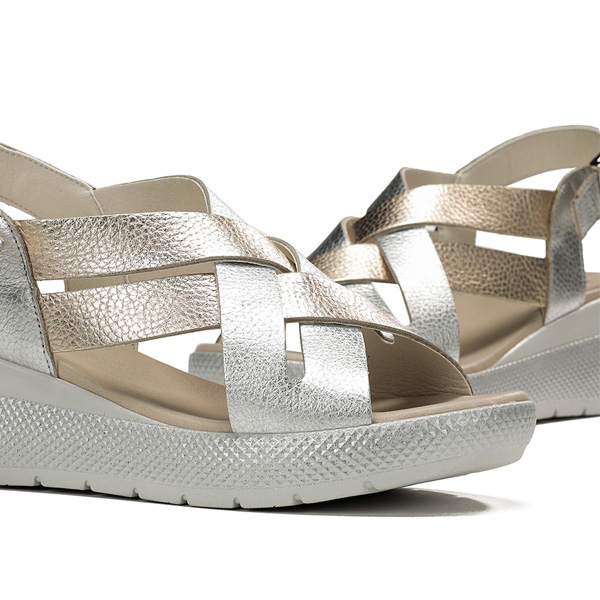 * Sandalia de dona fabricada amb pell, amb una combinació de colors daurats i platejats.