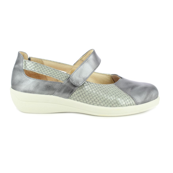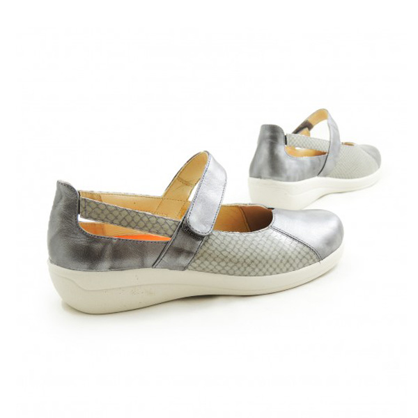 * Mercedetes per a dona fabricada amb pell, combinada amb to metal.litzat i imitació a serp.