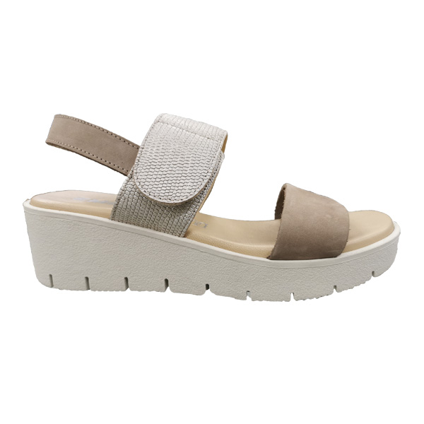 * Sandalia per a dona fabricada amb pell amb dues textures, nobuck i metal.litzada amb un gravat.