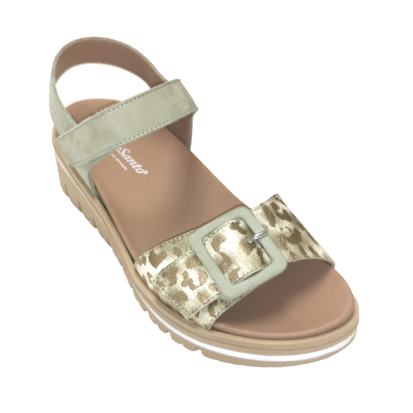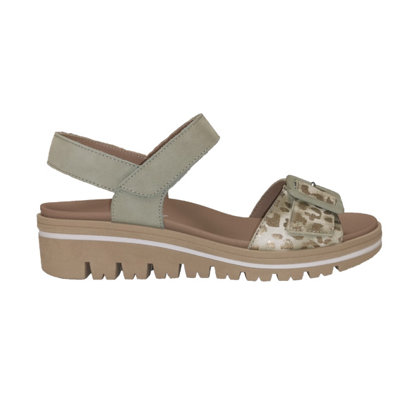 * Sandàlia de pell estampada d'animal print, color or envellit, la resta amb pell de serratge color verd menta.