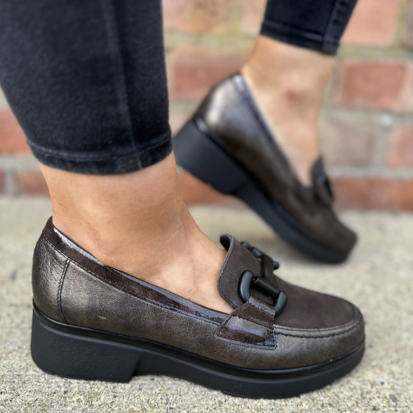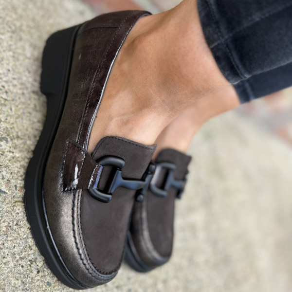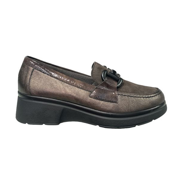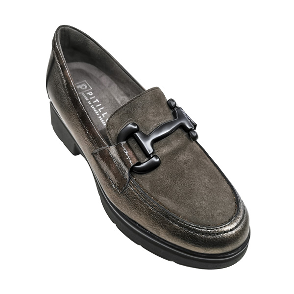 * Mocasí per a dona fabricat amb pell de gran qualitat, amb una combinació de pell metal.lalitzada als laterals, de xarol al rivet del voltant i la part davant d'ante.