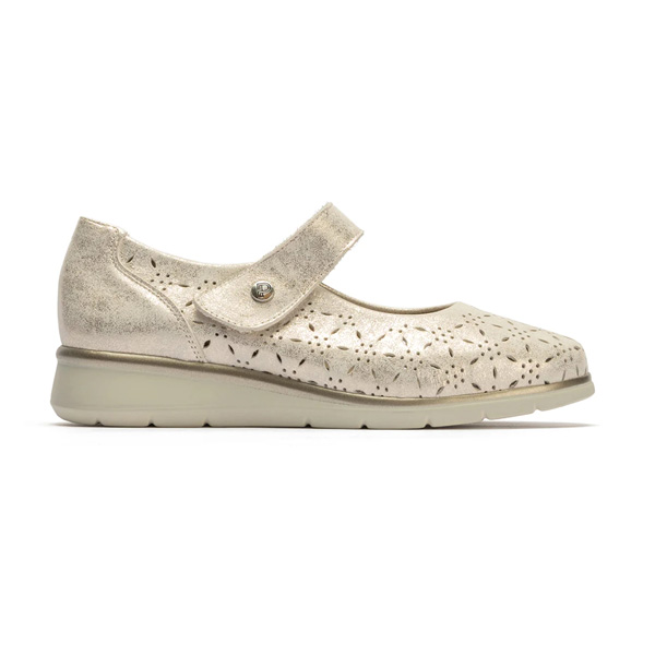 * Sabata per a dona fabricada amb pell amb una tonalitat metal.litzada, molt suau, amb un disseny geomètric foradat, ideal per la primavera-estiu.