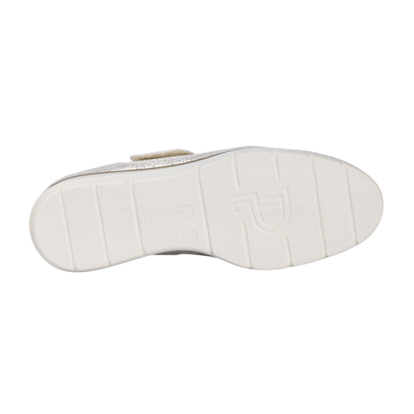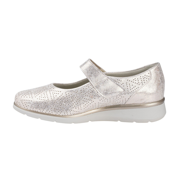 * Sabata per a dona fabricada amb pell amb una tonalitat metal.litzada, molt suau, amb un disseny geomètric foradat, ideal per la primavera-estiu.