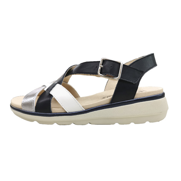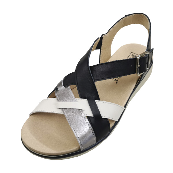 * Sandàlia amb tires amples i creuades, amb una combinació de blau marí, blanc i plata.