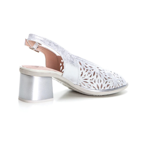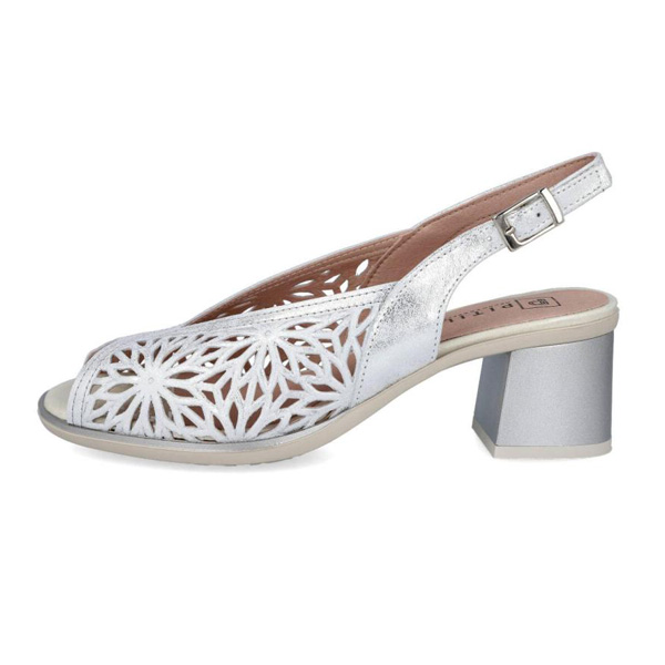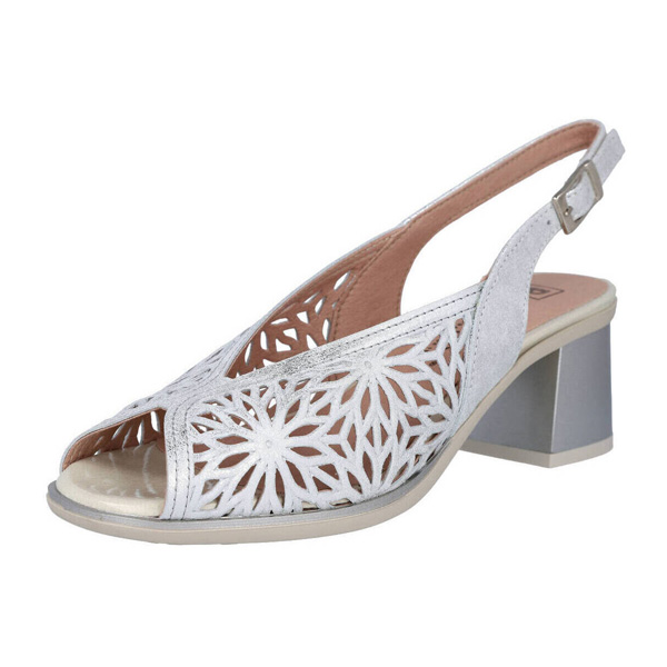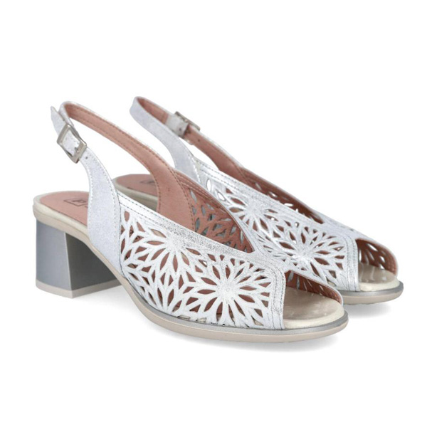 * Sandalia per a dona amb un disseny floral calat, de pell molt suau i un to metal.litzat, tot això la fa elegant i original.