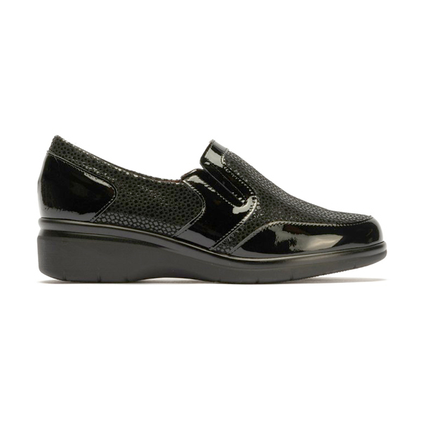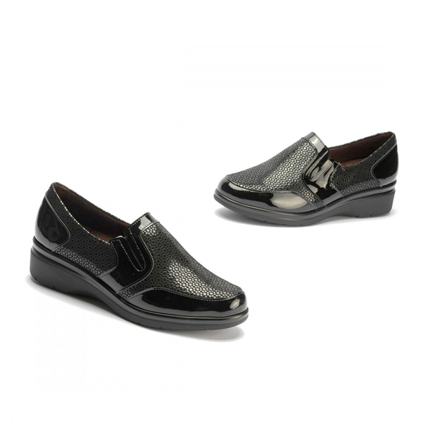 * Sabata per a dona fabricada amb pell de xarol i teixit de licra.