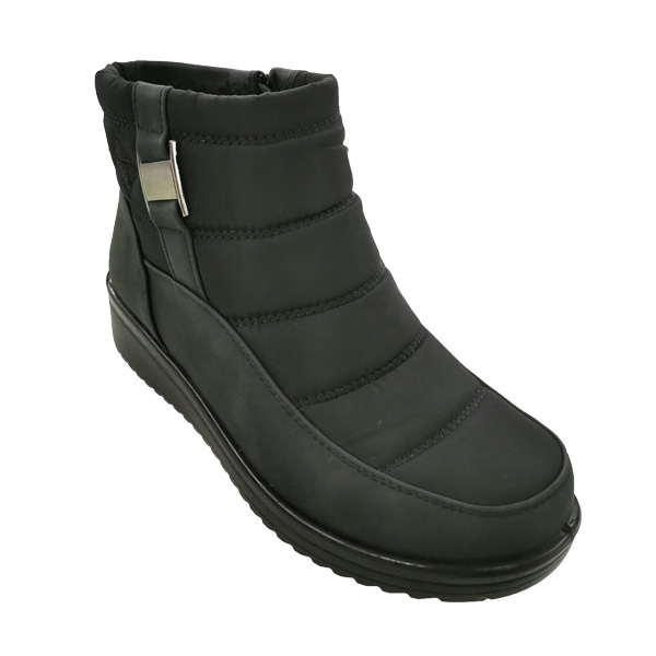 * Botí per a dona fabricat amb material sintètic imitació a pell, teixit exterior tipus “anorac” i forro interior amb teixit pelut tipus “borreguet” de color negre.